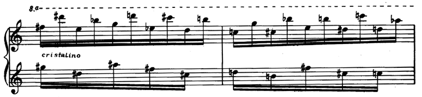2分ほどの短い曲だが、ブラジル風味たっぷりのいい雰囲気の曲。ヘ長調、A-B-A'形式。シンコペーションが小気味よい優雅な旋律で始まり、変ト長調〜変イ長調と転調しながら対旋律を加えつつ盛り上がる(ポリフォニックな旋律および対旋律と艶かしい和音が豊かな響きだ、下記の楽譜)。Bはレのミクソリディア旋法で16分音符連打の新たな旋律が野性的に奏され、グリッサンドや、8対3の変拍子などが現れる。Bの終わりは16分音符ド音の連打を残したまま、冒頭のシンコペーションの旋律が再現され、余韻たっぷりに終わる。