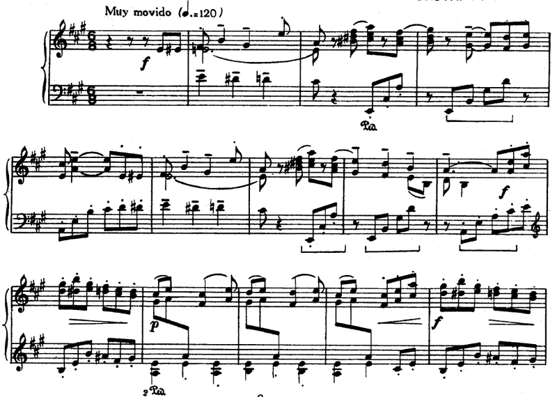 Gato correntino, de "La sangre de las Guitarras" (Danza americana Nº 5)、1-16小節、Ricordi Americana.より引用- Ollantay, de la opéra "Ollantay" (1926) オジャンタイ、オペラ「オジャンタイ」より