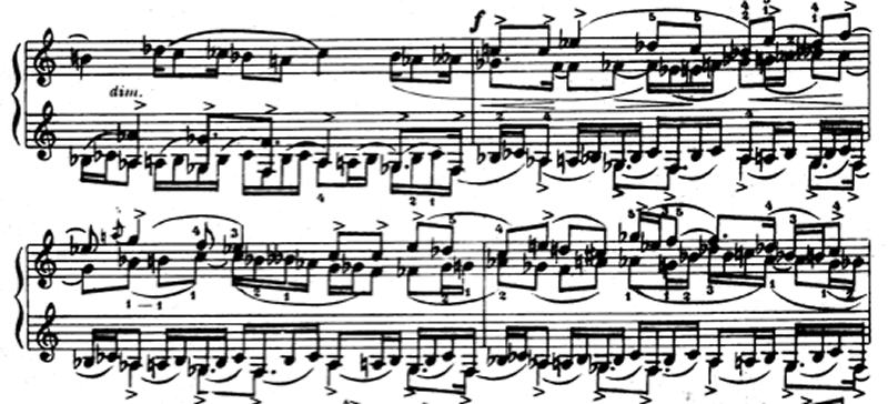 半音とオクターブから成る速い音列の羅列のような曲で、技巧的にかなりの難曲である。右手と左手の音型は鏡合わせのように対称的に書かれている。拍子が毎小節5/4~2/2~5/4~3/2~2/2~と変わるので、シンコペーションのパターンも♪♩♩♪♩♩|♪♩♪♩♩|♪♩♩♪♩♩|♪♩♪♩♪♩♩. | と次々と変化する緊張感ある曲。- Triste (1954) 悲しく