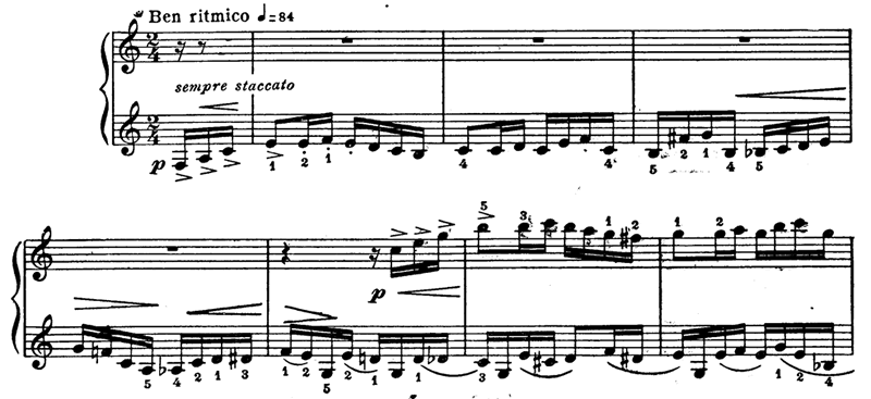 A-B-A'形式。トッカータ風で8分音符の両手交互連打(右手はオクターブ、左手は完全四度堆積の七度和音)が無窮動に続く。右手左手は、片方が白鍵だともう片方はフラットの黒鍵になっていることが多く多調の響きだ。1972