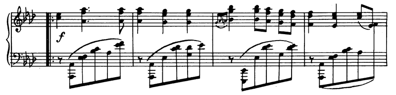 Bの部分は一転して、落ち着いた伸びやかな旋律が奏される(下記の楽譜)。I 度の和音に第II音や第VI音(変イ長調のこの曲ではラ♭-ド-ミ♭にシ♭やファ)を加えたり、V度の和音を属九にしたりを多用するのがナット・エンの好みというかこの地方の和音なのか、それがのどかで平和な田舎の雰囲気を上手く醸し出しているように思えます。