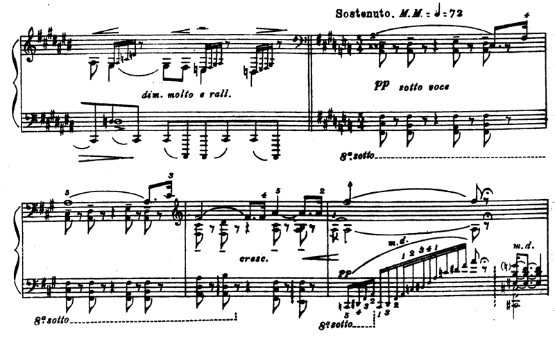 Bは右手にアルペジオが続く下で、信者の祈りの声を連想させるようなモチーフが中音部でオクターブ和音を伴って現れ、モチーフが繰り返される時はホ短調になる所が暗い影を感じさせる。Dは嬰へ短調になり、忍び足かはたまた葬送行進曲かのような静かな8分音符+8分休符の伴奏にのって呟くような旋律が現れ(下記の楽譜)、旋律は苦悶するように音を増すが、直ぐに静まり返ってしまう。