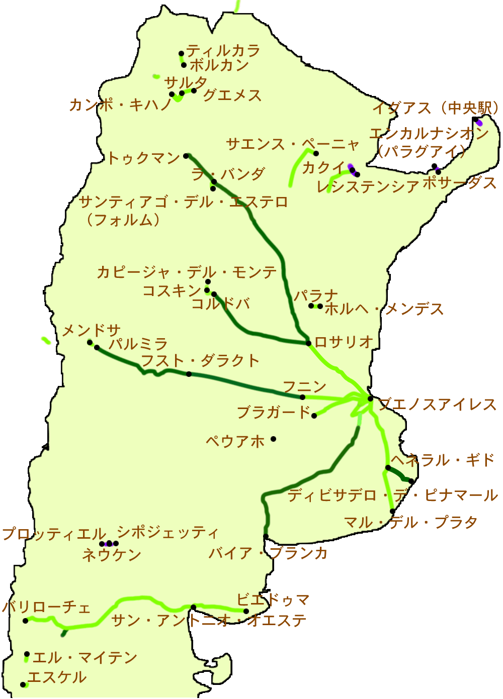 (98.68%)****上の地図を見ていると数km〜数十kmといった短距離の地方路線の乗り残しがアルゼンチン全土に散らばっている。鉄道紀行作家の故宮脇俊三氏が日本の国鉄を完乗した記録を綴った『時刻表2万キロ』(1978年河出書房新社)の第1章の終わりの方を引用すると、